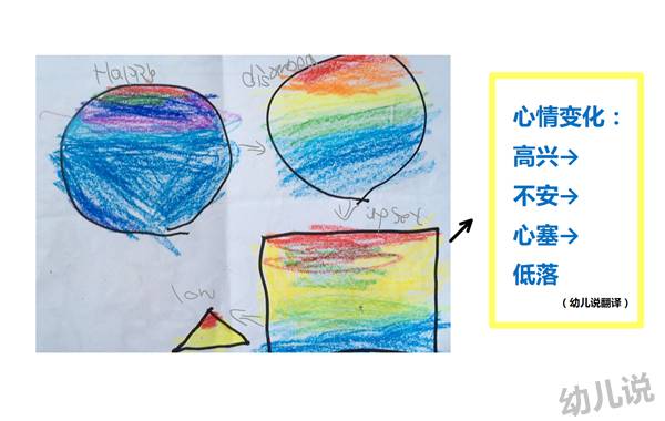 上面的画,是老师询问一位闷闷不乐的孩子发生了什么事,然后孩子画画跟老师表达自己的心理变化的过程,告诉老师自己为什么会因为穿了一件不合适的裤子回幼儿园后的心情变化。