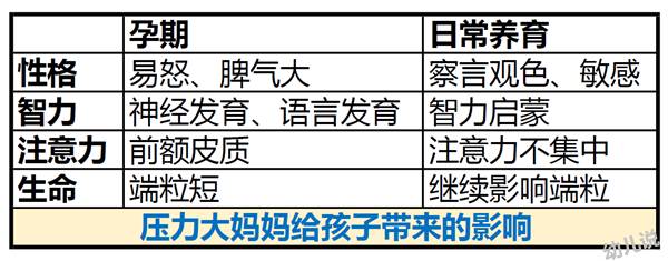 澳大利亚儿童专家斯蒂夫.比达尔夫说,妈妈孕期平静的心情,决定生出的宝宝是是快乐的还是紧张的。从怀孕起,妈妈的压力状况已经开始影响宝宝。孕妇压力大,宝宝出生后易怒,情绪常常难以安抚。压力大的孕妇体内的压力激素过量,通过胎盘袭击胎儿大脑的杏仁体,影响胎儿情绪调控能力。