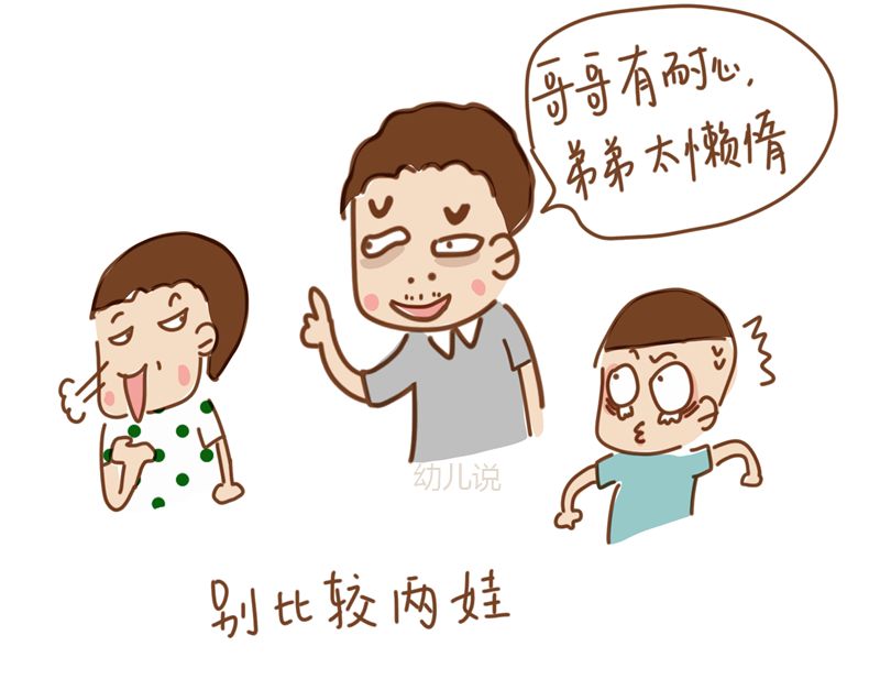 上面这位爸爸的说法,不仅激怒了小儿子,还会导致手足矛盾,以及小儿子对爸爸的怨恨……毫无疑问这是不妥的做法。除此之外,如果某个孩子从父母处明显地感觉到自己的劣势,为了突出自己的存在感,可能会做出一些极端的报复,比如欺凌自己的手足,或偷偷剪坏爸爸的领带等破坏行为。所以父母们尽量别比较两个孩子的优劣。