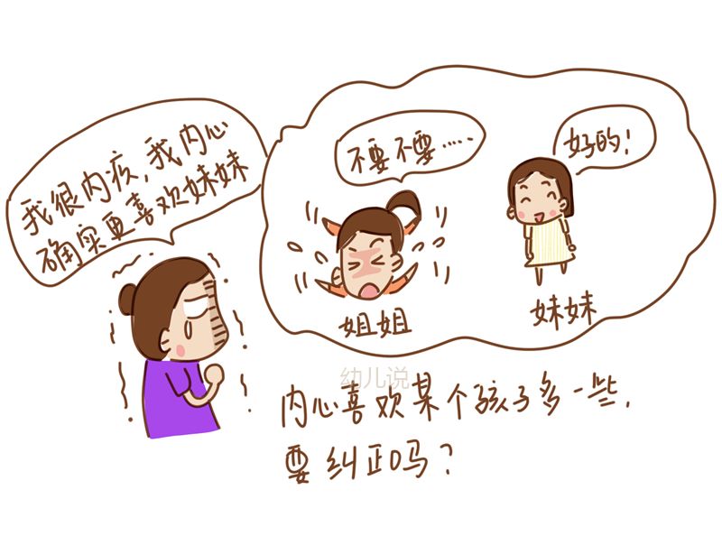曾经有妈妈苦恼地跟我说,她家两个孩子,两个都是女孩,一个4岁,一个2岁。4岁的姐姐有些固执和懒惰,还喜欢跟妈妈唱反调;相比之下,2岁的妹妹活泼可爱,还总是很听妈妈的话。这位妈妈说:“说实话,我更喜欢妹妹多一些,但理智告诉我,这是不对的,可是我和孩子们的爸爸,我们内心确实更喜欢妹妹,我因此经常感到很内疚……”