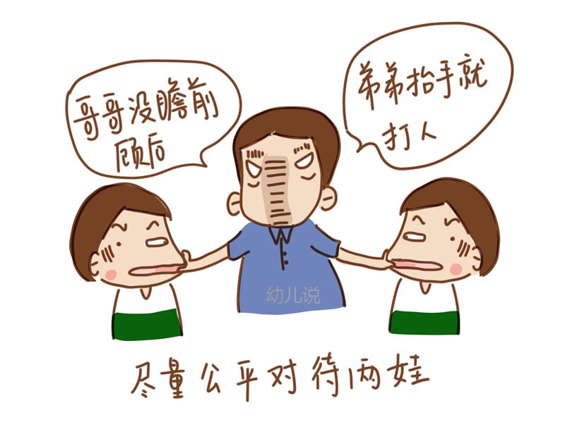 虽然很多二孩的父母,在他们内心里常常对某个孩子有偏爱,幼儿说在前面“轮流的偏爱”和“固定的偏爱”有说过。但是父母们,请尽量别在对待孩子的具体行动上,表现出明显的偏爱或不偏爱。因为天生有争宠需求的孩子,他们总是敏感的观察者。过于明显的不公,会让手足关系紧张。正如著名心理学家阿德勒所言,“手足战争的最大症结在于,每个孩子都需要得到关注。”所以,父母们在对待两个孩子上,尽量做到公平对待。