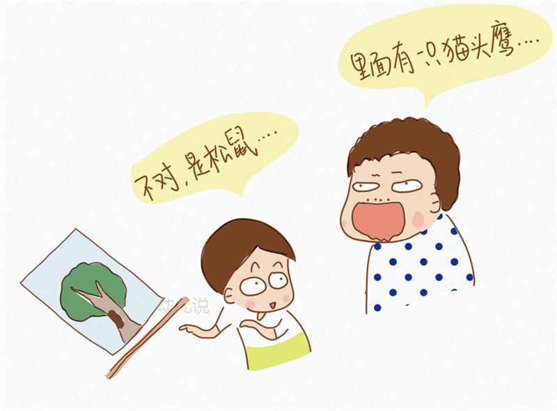 我帮那位爸爸点出了一个小细节,他把那张树画拿出来,跟儿子说:“我看到了树干上有个树洞,让我想到了里面可能有一只猫头鹰!”