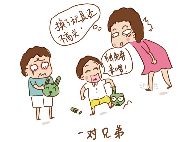 那一天,这对兄弟的妈妈,给他们各自买了一只塑料兔子玩具。没多久,哥哥便不小心把兔子玩具摔了,导致玩具兔子的一只耳朵断裂了。哥哥开始皱眉,眼圈瞬间发红了,他喃喃地在弟弟旁边“摩耳朵”:“你前天不是说很爱我?跟我交换玩具吧!”弟弟“哈哈大笑”着,用自己的那只完整的兔子玩具,跟哥哥交换了那只坏玩具兔子,哥哥这才双眉舒展。才过了一会儿,当他看到弟弟“哈哈”笑着,把手里的那只断耳朵兔子玩具想象成了一只独角兽,脸上满是兴奋的笑容时,哥哥又开始双眉紧皱、眼圈发红……
