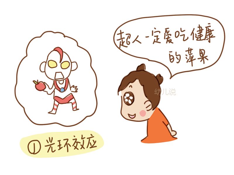 上面一些小朋友行为转变的背后,其实是光环效应在起重要作用。因为超级英雄已经在小朋友内心建立了美好的形象,他们是正义的、助人为乐的、健康的、积极乐观的……在这些积极品质的影响下,小朋友趋向于认同这些超级英雄在其他方面也是积极和健康的,所以超人爱吃健康的苹果也就自然而然了。除此之外,还有爱屋及乌的心理在背后起作用。