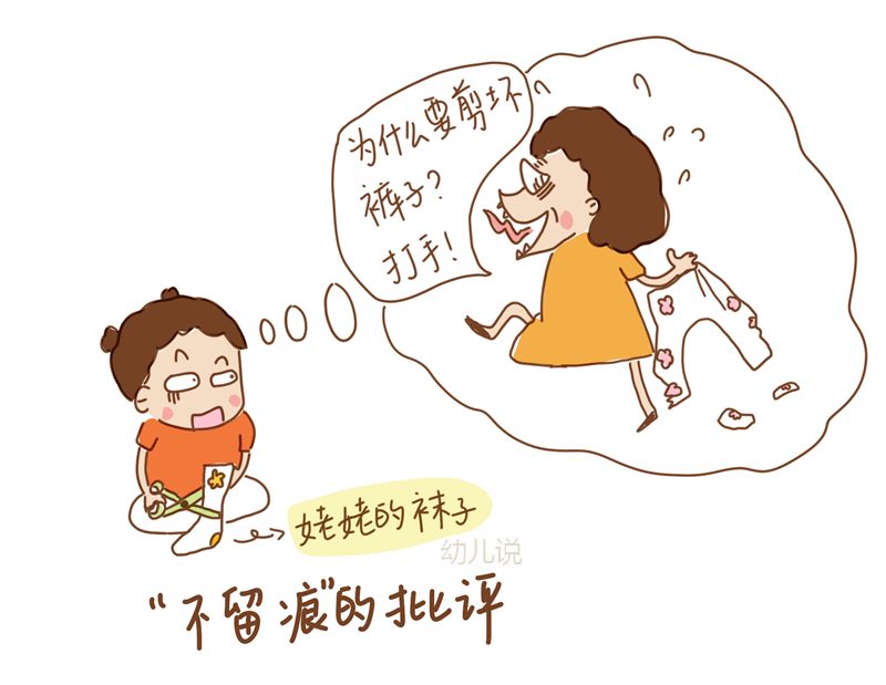 一位小女孩把姥姥给她做的小花裤剪了,姥姥批评外孙女没礼貌,还往小女孩的小手打了几下。小女孩“哇哇”哭了一会,当姥姥从厨房出来,发现小女孩又拿着剪刀剪姥姥的一只袜子……半小时前的批评似乎毫不留痕。