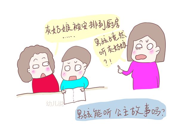 一位妈妈到我家里,发现我给幼儿园年龄的儿子读灰姑娘的童话故事,大为不解。她说男孩子听公主故事会变得“娘腔”,所以在她家里小朋友的童书绘本,凡是公主题材的,什么玫瑰公主、白雪公主、灰姑娘等,她都不会讲给儿子听;而她家的女儿很爱公主类型的童话,她总喜欢给女儿买公主和女孩儿题材的绘本。