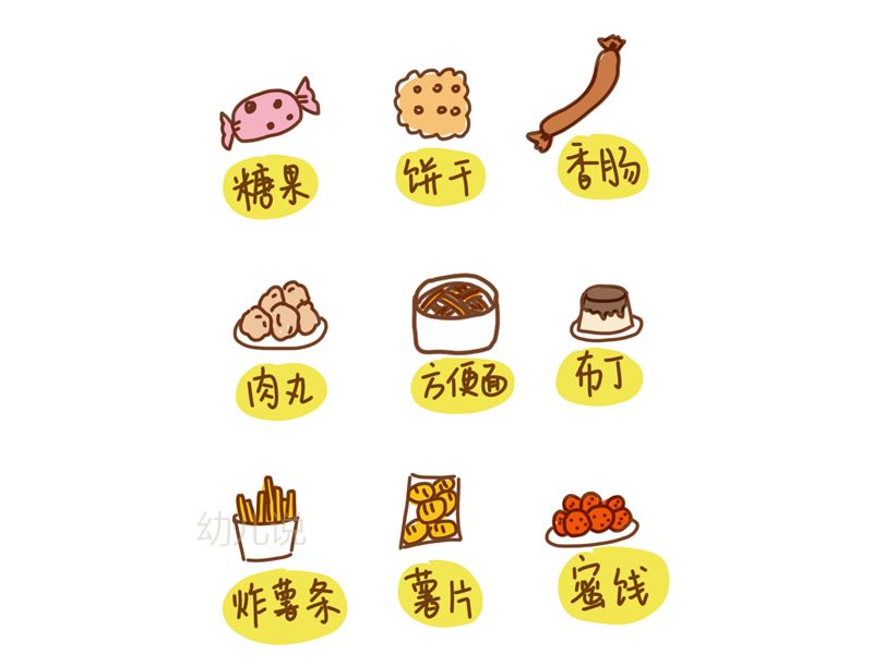 把那些看起来特别好看、可口的零食和加工食品,视为潜在危险食物,往往不会错。下面这些食物,常常是小朋友的最爱,也是含有大量食品添加剂的加工食物,建议还是少吃为妙: