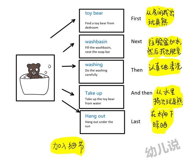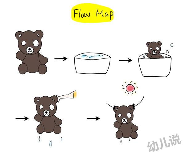 接着,老师让孩子们画流程图(Flow Map),Flow Map是美国学校鼓励孩子从小就要掌握的一种思考方式。(下图是幼儿说为示例所画)
