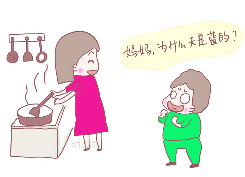 一位小男孩“咚咚咚”走到厨房,兴高采烈地对正在炒菜的妈妈问了一个有趣的问题:“妈妈妈妈,为什么天是蓝的?”这位妈妈一下子回答不了,她立即关掉了煤气炉,大声称赞:“你问得真好!”然后母子俩兴高采烈地一起去寻找答案。